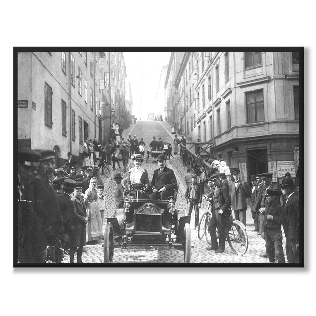 Poster med fotografi av bilentusiasten Alexandra Gjestvang som är ute och sladdar på Söder i Stockohlm med sin far 1907. Alexandra var den första kvinnliga bilföraren i Sverige här ser man henne i sin Oldsmobile. Antagligen var det lite kämpigt åt andra hållet, dvs uppför den branta delen av Brännkyrkagatan kallad "Besvärsbacken", som än idag får bilar att gå på högvarv.