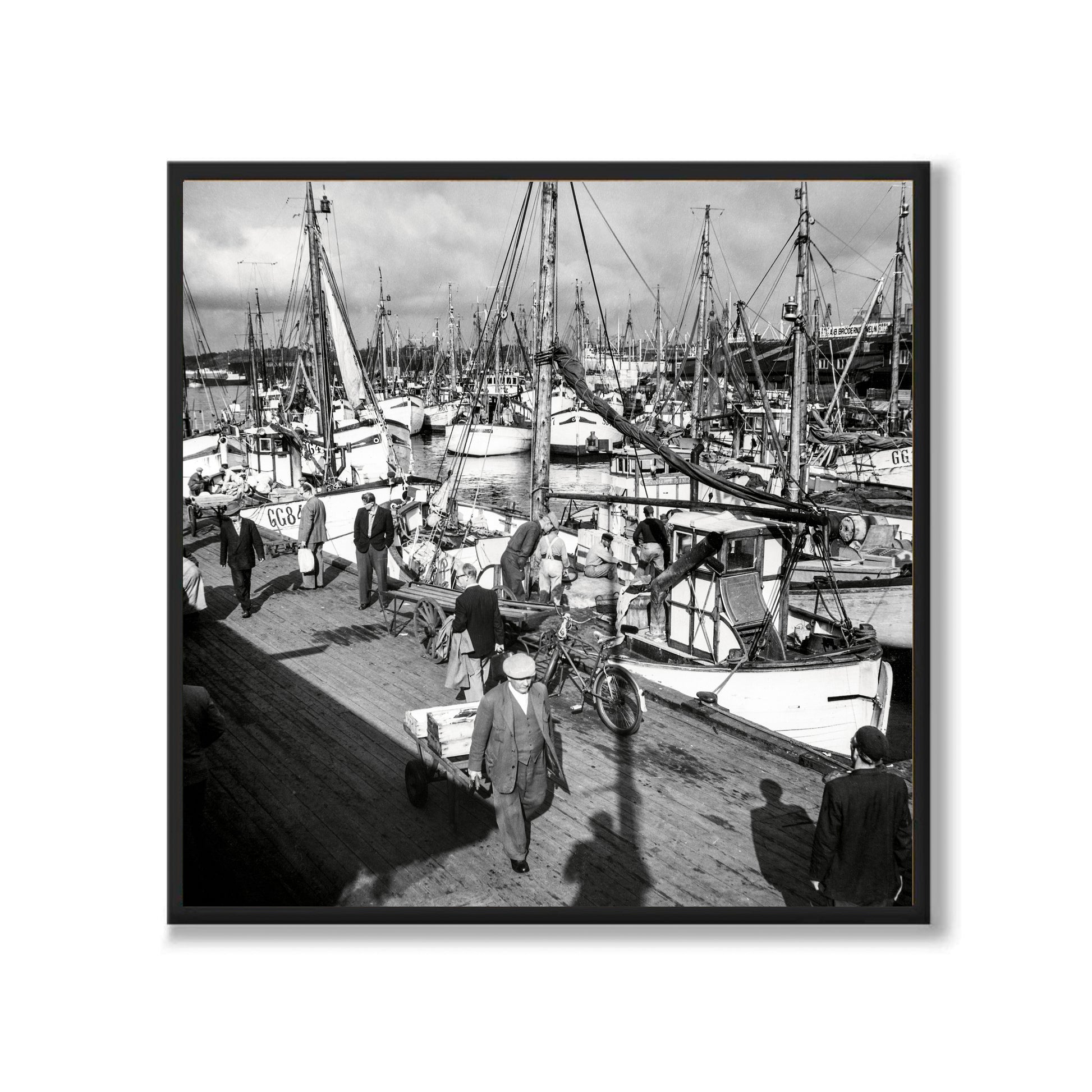 Poster med fotografi av fiskehamnen i Göteborg, troligen tagit 1952.