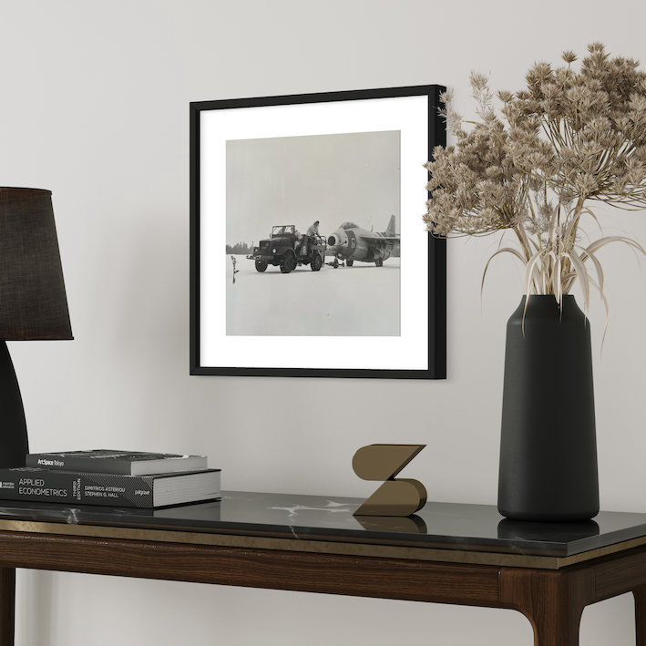 Poster med fotografi av en SAAB J29 "Tunnan" som blir bogserad inför en flygövning i Norrland under vintern 1962-63.