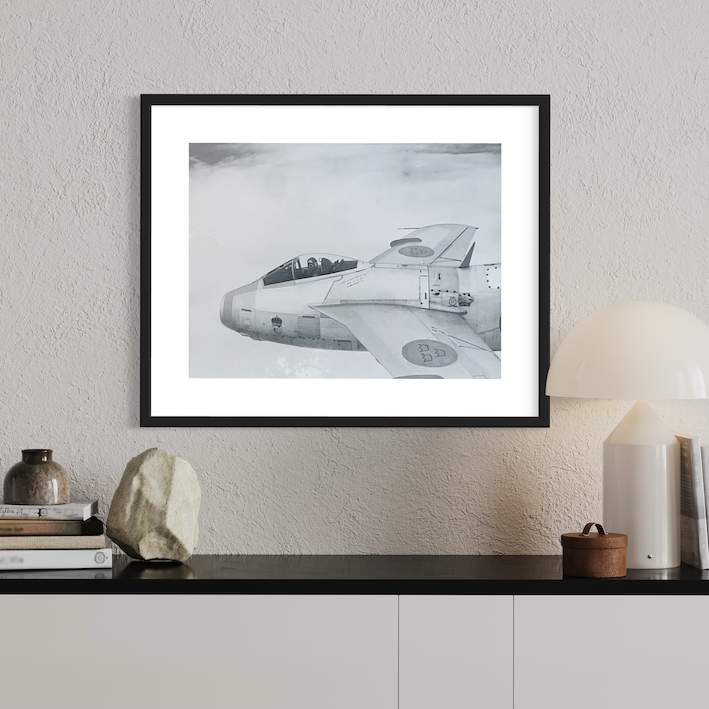 Poster med fotografi av en SAAB J29 från Kungliga Jämtlands flygflottilj (eller F4) taget från det andra flygplanet i roten. Bilden är tagen 1961, någonstans över Jämtland.