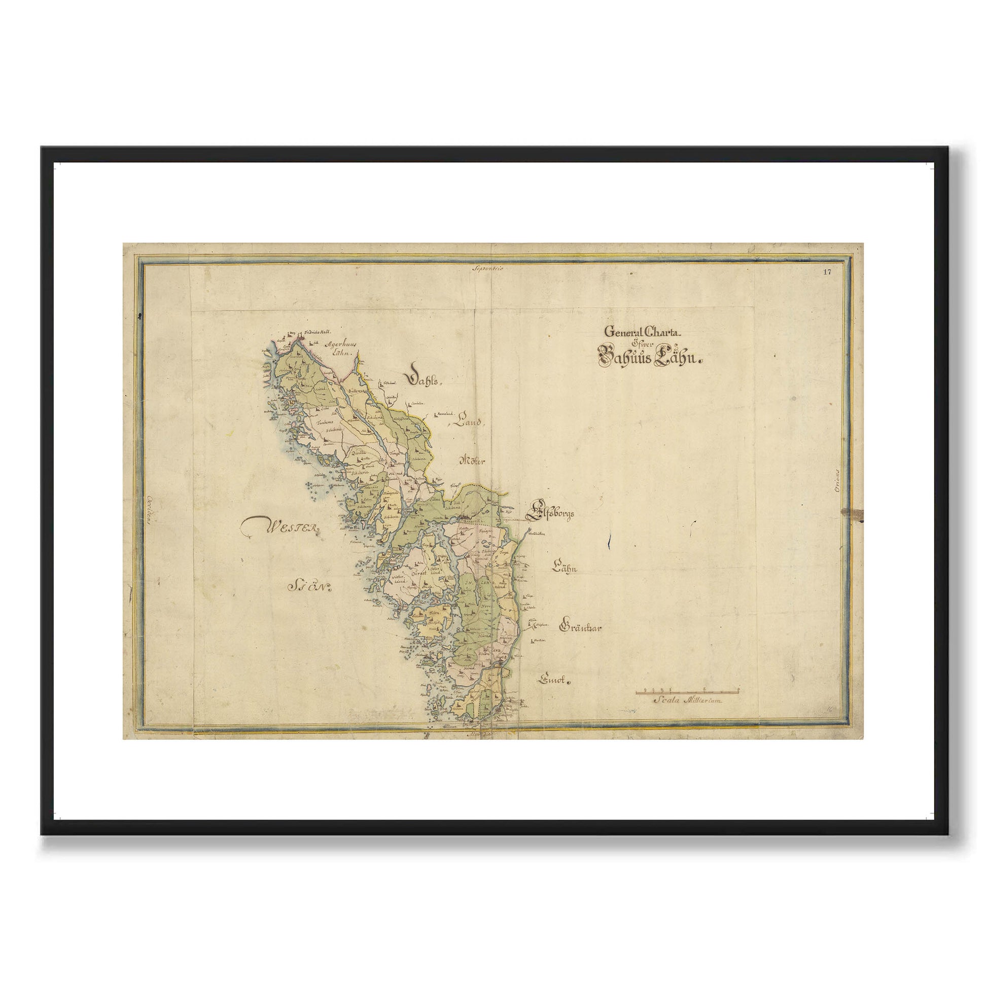 Poster med reproduktion av historisk karta över Bohuslän från senare delen av 1600-talet.