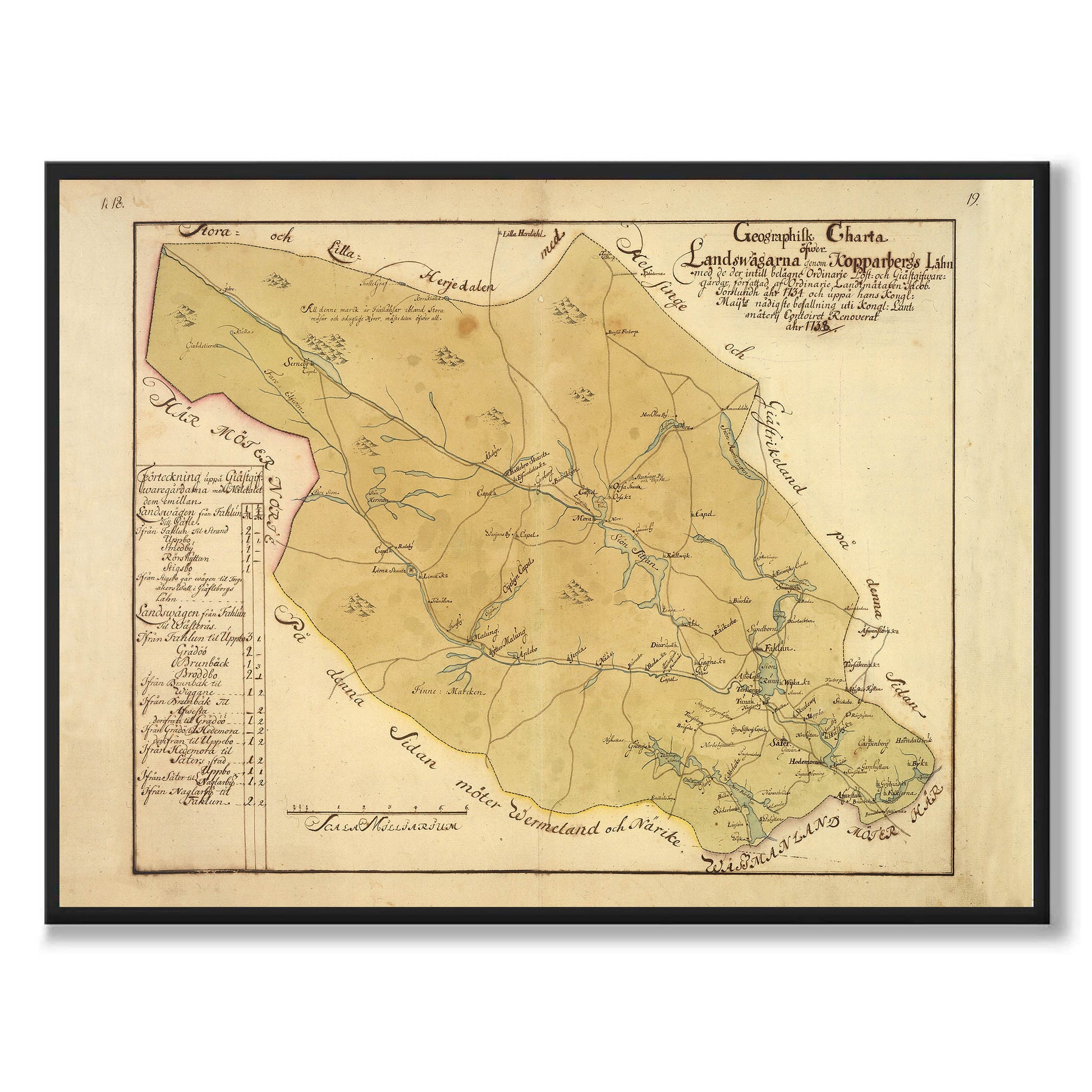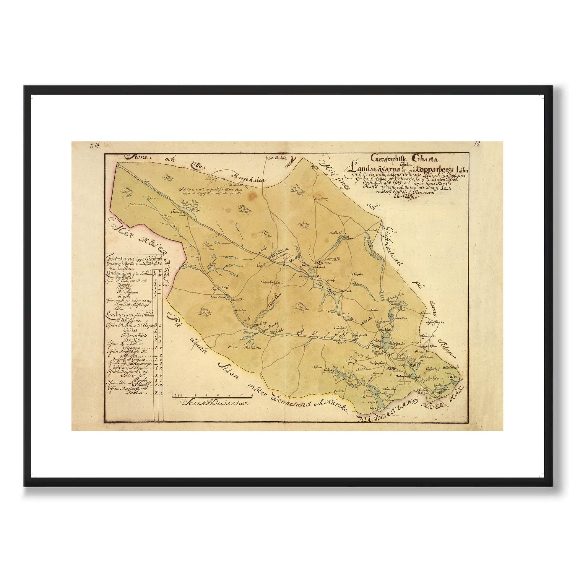 Poster med reproduktion av historisk karta över Dalarna från 1734.