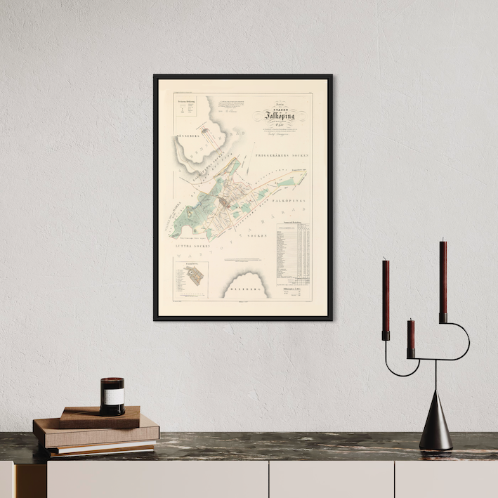 Poster med reproduktion av historisk karta över Falköping från Ljunggrens klassiska atlas. Kartmästare Erik Gustaf Ljunggren fick under 1850-talet i uppgift att ta fram kartor över samtliga svenska städer. Den första kartan producerades 1853 och den sista 1861.