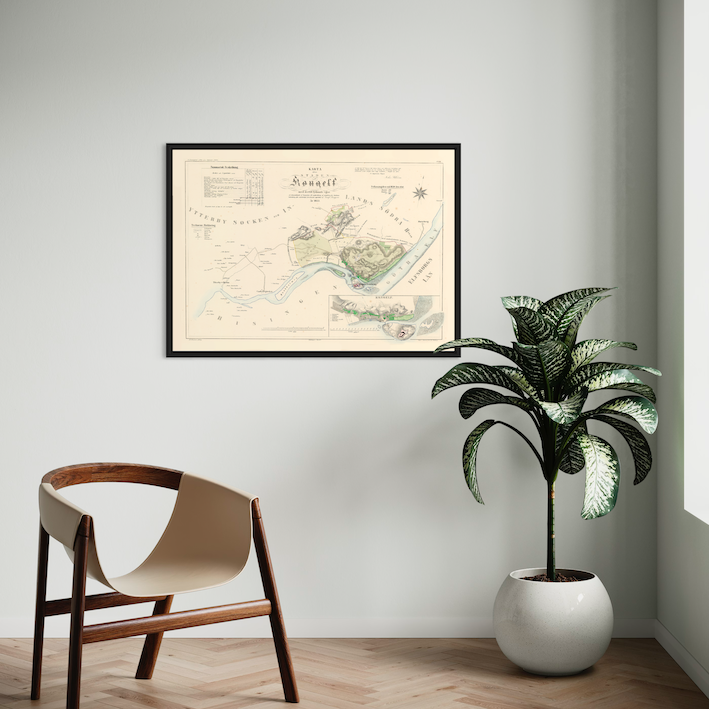Poster med reproduktion av historisk karta över Kungälv från Ljunggrens klassiska atlas. Kartmästare Erik Gustaf Ljunggren fick under 1850-talet i uppgift att ta fram kartor över samtliga svenska städer. Den första kartan producerades 1853 och den sista 1861.