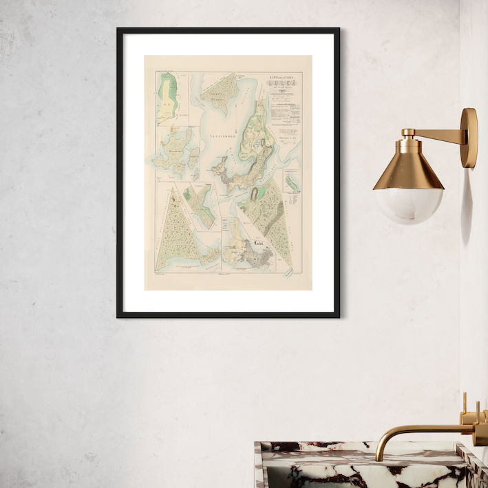 Poster med reproduktion av historisk karta över Luleå från Ljunggrens klassiska atlas. Kartmästare Erik Gustaf Ljunggren fick under 1850-talet i uppgift att ta fram kartor över samtliga svenska städer. Den första kartan producerades 1853 och den sista 1861.