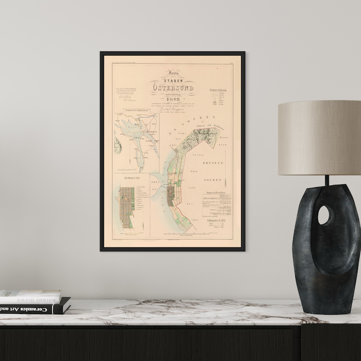 Poster med reproduktion av historisk karta över Östersund från Ljunggrens klassiska atlas. Kartmästare Erik Gustaf Ljunggren fick under 1850-talet i uppgift att ta fram kartor över samtliga svenska städer. Den första kartan producerades 1853 och den sista 1861.