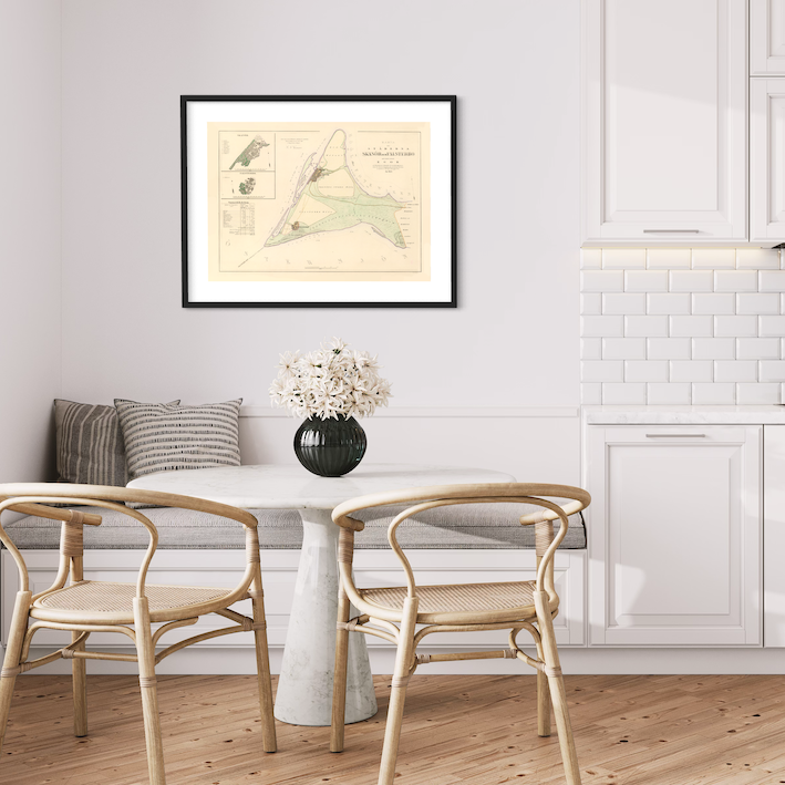 Poster med reproduktion av historisk karta över Skanör och Falsterbo från Ljunggrens klassiska atlas. Kartmästare Erik Gustaf Ljunggren fick under 1850-talet i uppgift att ta fram kartor över samtliga svenska städer. Den första kartan producerades 1853 och den sista 1861.