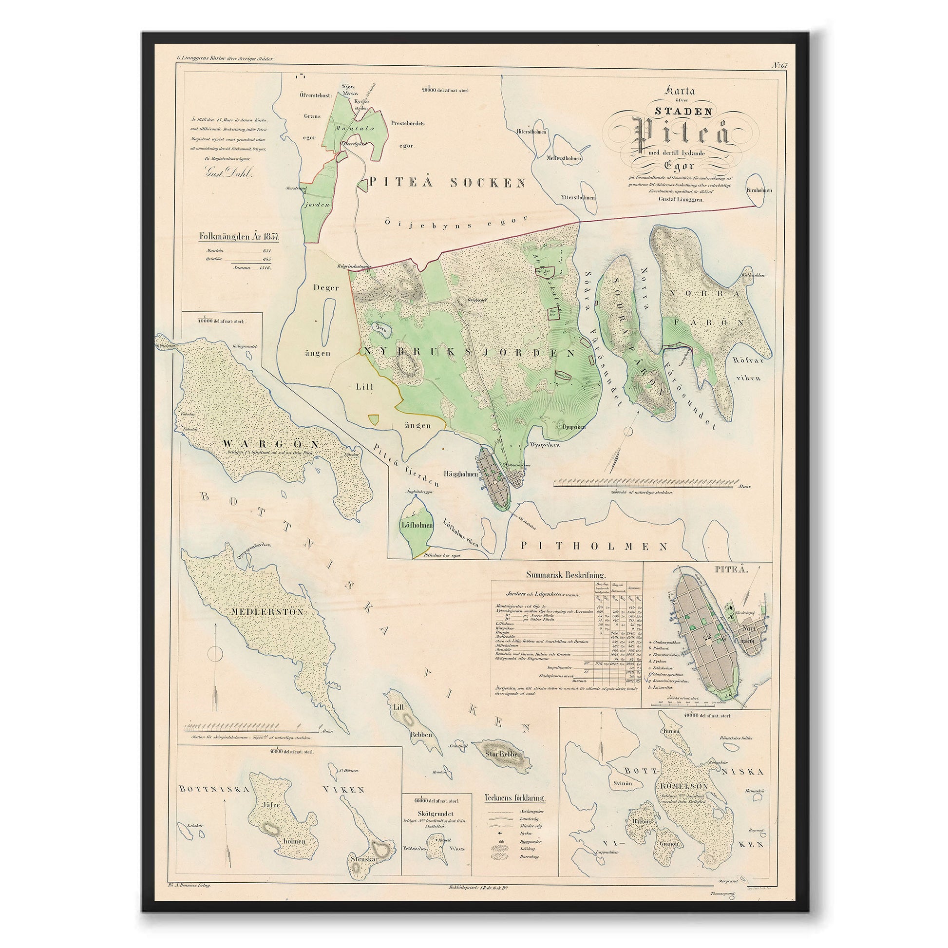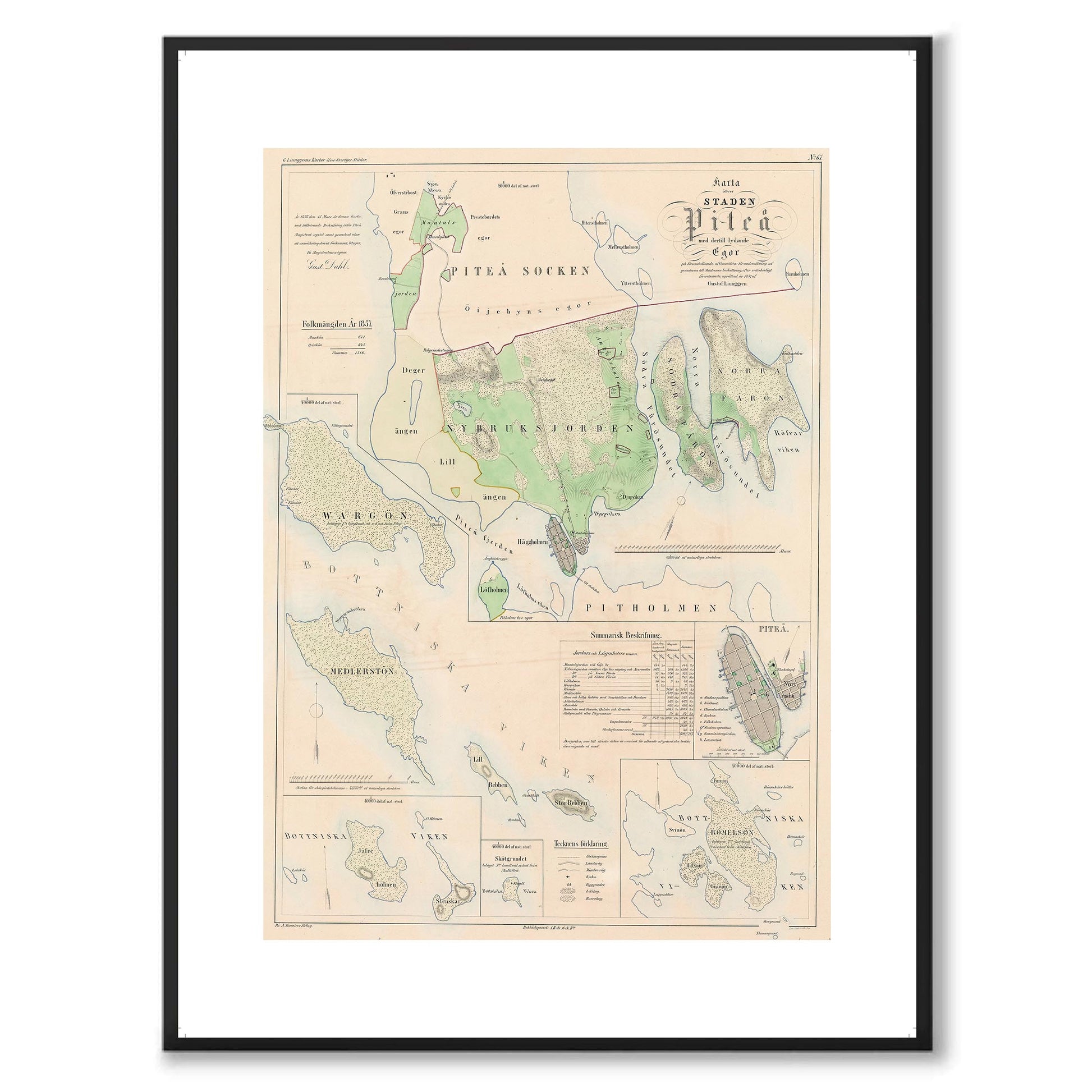 Poster med reproduktion av historisk karta över Piteå från Ljunggrens klassiska atlas. Kartmästare Erik Gustaf Ljunggren fick under 1850-talet i uppgift att ta fram kartor över samtliga svenska städer. Den första kartan producerades 1853 och den sista 1861.