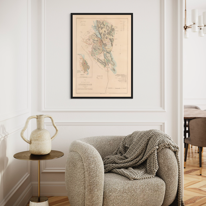 Poster med reproduktion av historisk karta över Södertälje från Ljunggrens klassiska atlas. Kartmästare Erik Gustaf Ljunggren fick under 1850-talet i uppgift att ta fram kartor över samtliga svenska städer. Den första kartan producerades 1853 och den sista 1861.