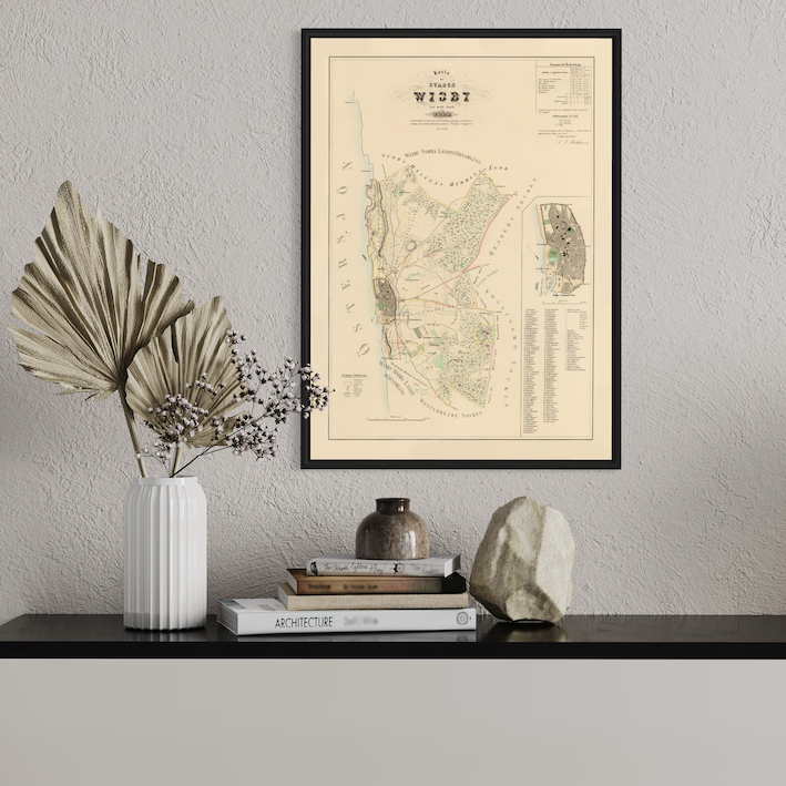 Poster med reproduktion av historisk karta över Visby från Ljunggrens klassiska atlas. Kartmästare Erik Gustaf Ljunggren fick under 1850-talet i uppgift att ta fram kartor över samtliga svenska städer. Den första kartan producerades 1853 och den sista 1861.