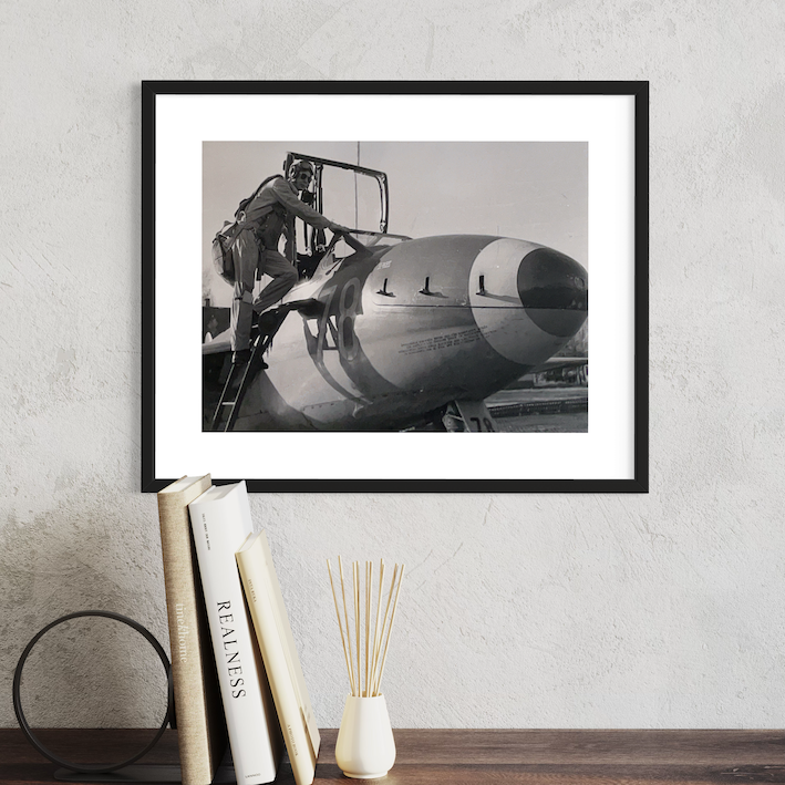 Poster med fotografi av en pilot under utbildning sätter sig tillrätta i sitt skolflygplan inför sin första EK-flygning (EK=enkelkommando) på Krigsflygskolan i Ljungbyhed sensommaren 1960.