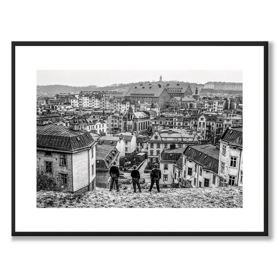 Poster med ett mäktigt fotografi av tre pojkar som ser ut över staden som de en dag ska erövra. Taget från Skansberget någon gång under 1950-talet.
