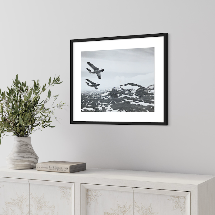 Poster med fotografi av en rote av SAAB J29:or över Oviksfjällen, troligen våren 1962. En rote är den minsta enheten inom flygvapnet och utgörs alltså av två flygplan tillsammans, en roteetta som är ledaren, samt en rotetvåa.